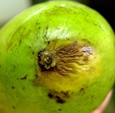Bacterial black spot symptoms on mango fruit. Note star-like cracks on the fruit.