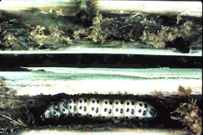 Active full-grown millet stemborer (Coniesta ignefusalis) larva (feeding and damage) in millet stem.