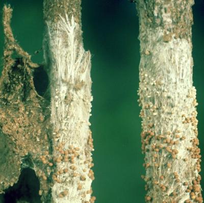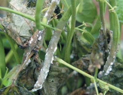 White mould on bean pods (Sclerotinia sclerotiorum).