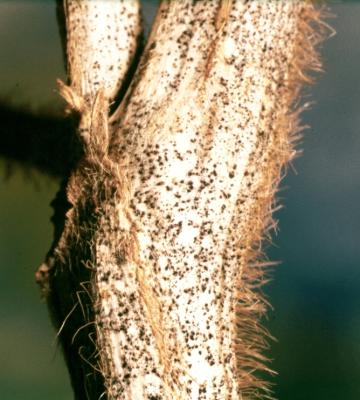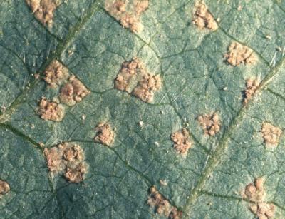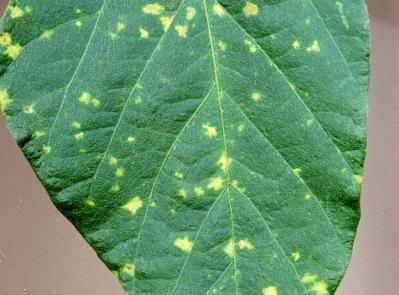 Soybean rust (Phakopsora pachyrhizi) symptoms on lower leaf surface