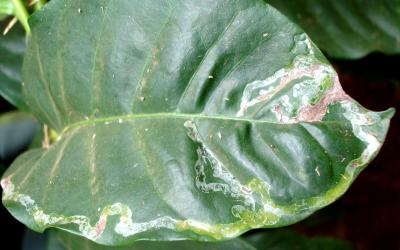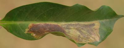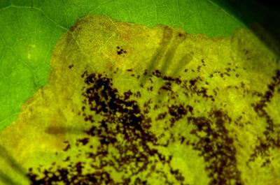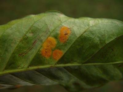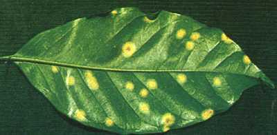 Coffee leaf rust (Hemileia vastatrix) - Coffee leaf undersurface showing lesions of coffee leaf rust.