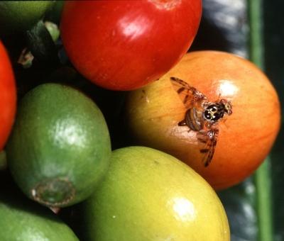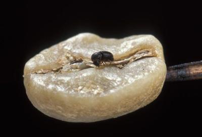 Coffee berry borer - Adult female on a green coffee bean. Females are 1.4 to 1.6 mm long.