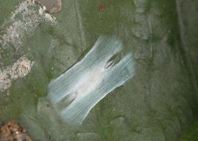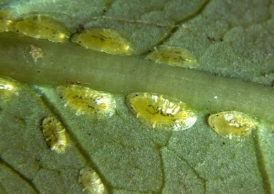Soft green scale (Coccus viridis) are immobile and can usually be found settled at underside of leaf, close to central vein or near tips of green shoots. They are flat and oval (about 3 x 2 mm).