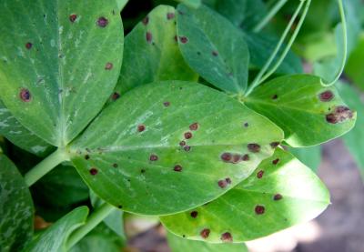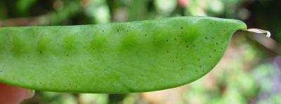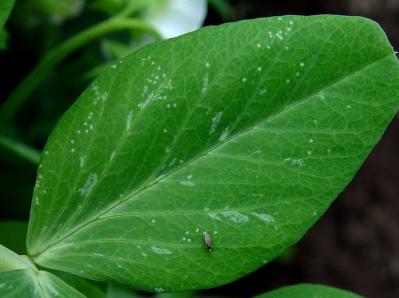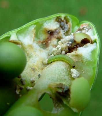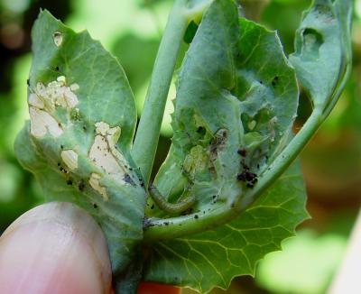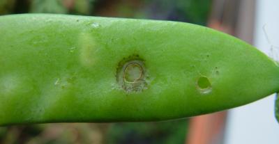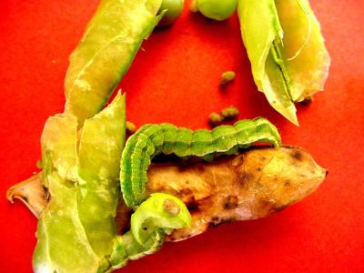 Damage by the beet armyworm on garden peas. Real size about 25 to 30 mm long.