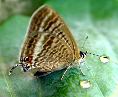 Blue pea butterfly. Male wingspan is 2.8-3.4 cm, upperside purplish-blue suffused with grey scales and with a distinct black marginal line; marginal fringe greyish-white. Female wingspan is 2.5-4.2 cm; upperside dark brown with purple scales at the base and discal area.