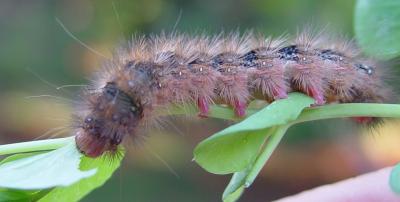 Brown hairy caterpillar on snowpea. Real size: about 40 mm long.