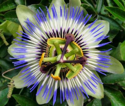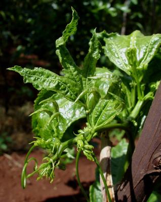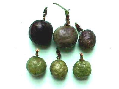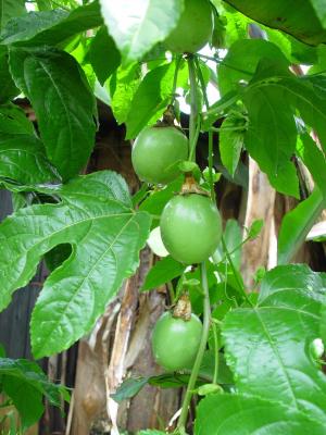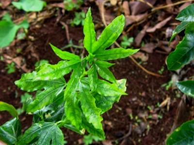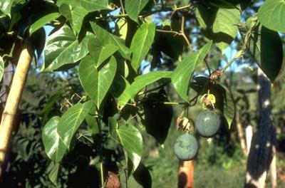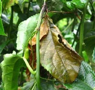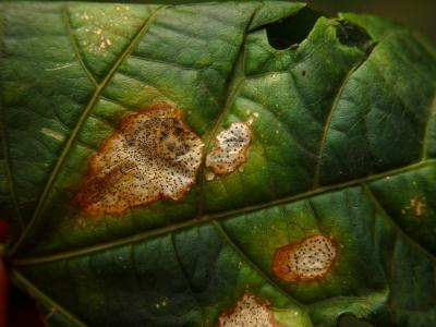 Septoria leaf spot on passionfruit. Note fruiting bodies containing fungal spores seen as minute black dots within the spots.