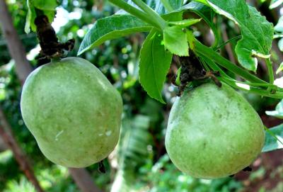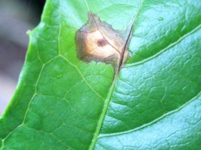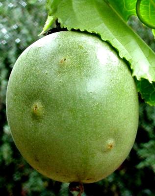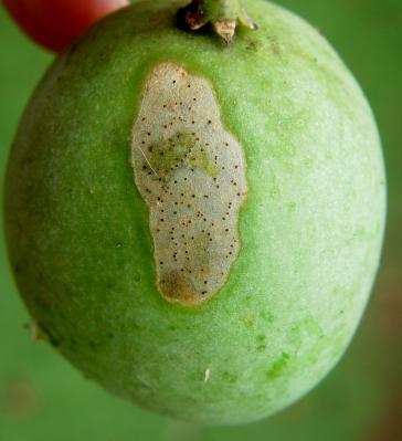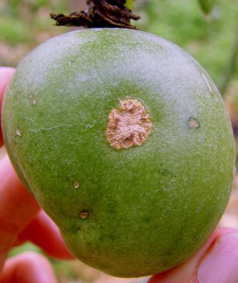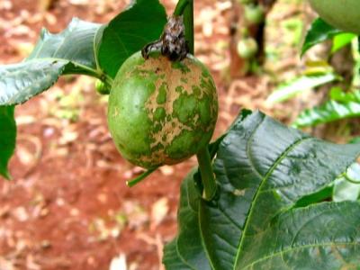Septoria spot on passionfruit. Note fruiting bodies containing fungal spores seen as minute black dots within the spots.
