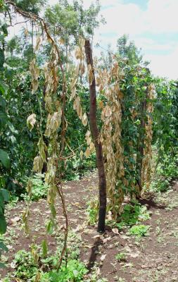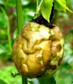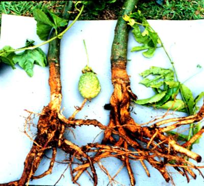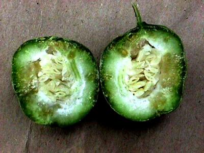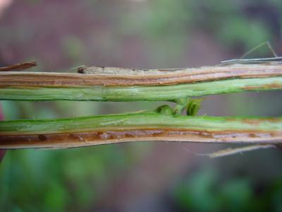 Close-up of a cut stem showing brownish water-conducting tissues due to Fusarium wilt
