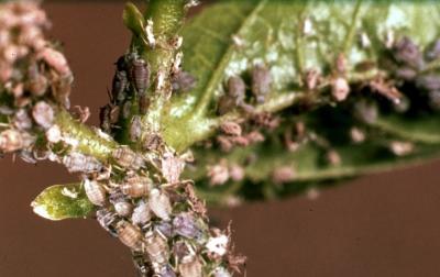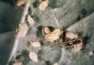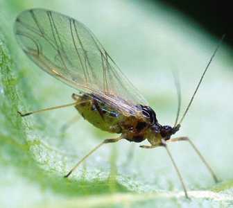Cabbage aphid, winged form. This soft bodied, pear-shaped insect is usually wingless and about 1,16 mm long. The wingless female is pale yellow green. The winged migrant form has a yellowish green abdomen with a dark dorsal blotch. Winged forms migrate to other hosts in late spring. During these migratory flights, aphids may spread virus diseases from infected volunteer plants and weeds to healthy plants.