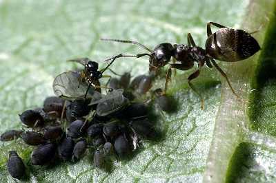 Black bean aphids (A. fabae) colony (nymphs and alates) on leaf of runner bean (Phaseolus coccineus). Note the presence of an attendant ant (Lasius sp.) and, in centre of the picture, a hymenopteran parasitioid ovipositing into the aphids. A. fabae is a dark brownish to matt black aphid. Adults are often bigger than other Aphis spp. Apterae 1.5-3.1 mm, alatae 1.3-2.6 mm.