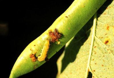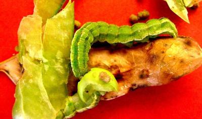 Damage by African bollworm on French beans. Note faeces next to the caterpillar.