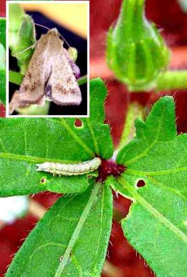 Young caterpillar of African bollworm feeding on okra leaf and adult moth (inset).