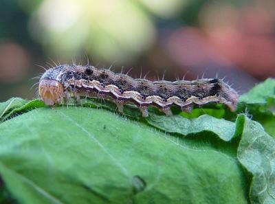 African bollworm on French beans. Fully grown caterpillars are 3-4 cm long.
