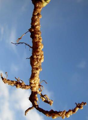 Okra roots damaged by root-knot nematodes. Note gall or root-knots (left) and healthy roots (right).
