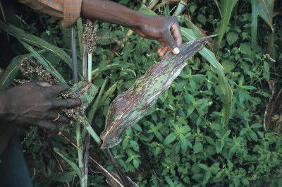 . (Glomerella tucumanensis It produces tiny reddish lesions (2-3 mm long and about 0.5 mm wide) on the upper surface of the lamina and their abundance gives it a rusty-brown appearance. In the mid-rib, lesions usually start as minute red spots on the upper surface and develop in both directions, forming small, long lesions. The spots are red to begin with, but later become straw coloured with dark reddish-brown margins.