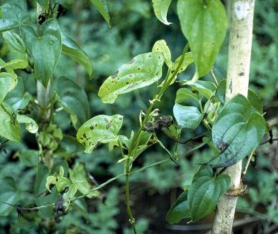 Anthracnose (Glomerella cingulata) on yam (Dioscorea alata). On cotyledons and leaves, lesions are often dark, necrotic, angular or irregular in shape. They may be pale with less necrosis. A more general spreading necrosis turning to leaf blight may also occur.