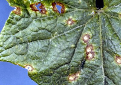 Anthracnose (Colletotrichum orbiculare) damage to pumpkin leaf (Cucumis sativus).