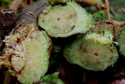 Fusarium wilt on passionfruit. Close-up of a cut stem showing brownish water-conducting tissues.