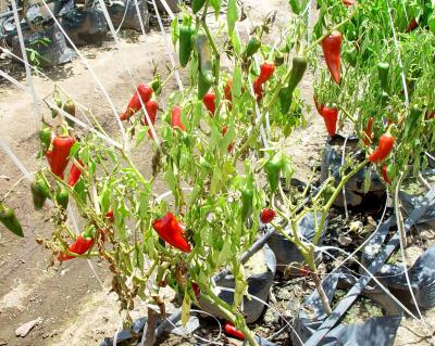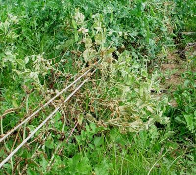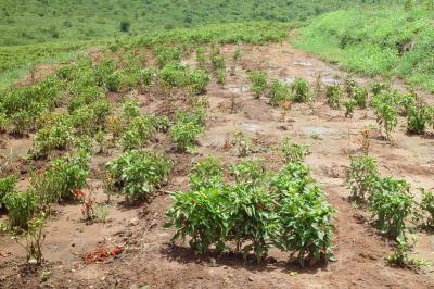 Chili field infected with Fusarium wilt. Note gaps due to death of plants.