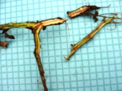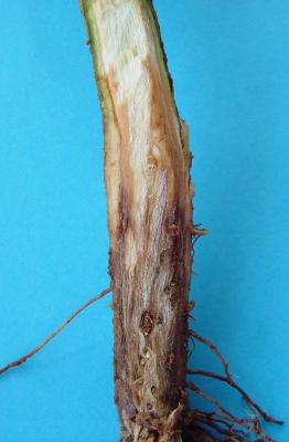 Sweet pepper root infected with Fusarium wilt. Note brown discolouration of vascular tissues.