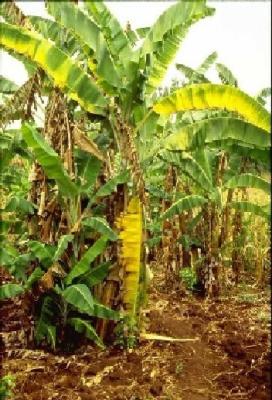 Fusarium wilt symptoms (Fusarium oxysporum f.sp. cubense) on banana leaves. Banana cultivar 'Bluggoe' with yellowing symptoms on lower leaves
