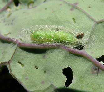 Diamondback moth pupa is 5 to 6 mm long, about four times as long as the width. It is covered with a white silken cocoon. Initially pupa is pinkish-white to pinkish-yellow.