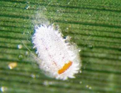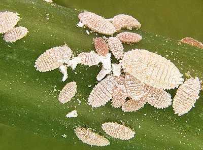 Female mealybugs on passion fruit leaf. Female mealybugs are 3 to 5 mm long and their body is usually covered with a waxy secretion.