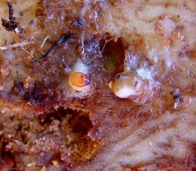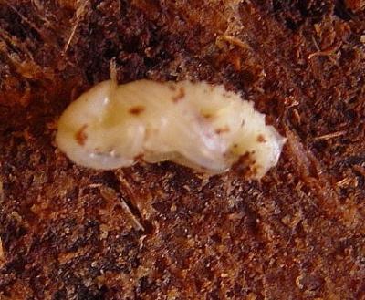 Grubs of banana weevils in tunnel in banana corm. The fully-grown larva is about 1 cm long.