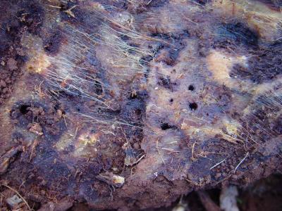 Banana corm damaged by banana weevil. Note tunnelling by weevil grubs and rotting of corm.
