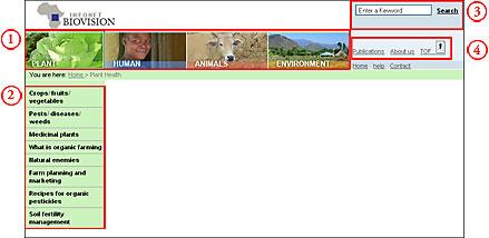 The main sections (plant, human, animal, environment) for information about sustainable agriculture, health and ecological methods are accessible by the horizontal image navigation bar. By clicking on one of the images the selected main section will appear.