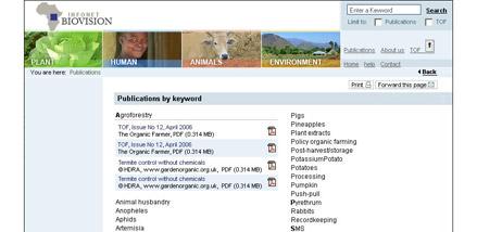 The result page will list all pages, publications and issues from TOF (The Organic Farmer Magazine) containing your entered keyword (marked in red). For more information about the list results click on the underlined links 'more...'