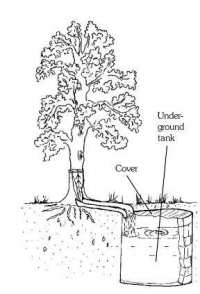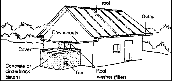 | Example of a roof rainwater collection installation. Water is collected on the roof and diverted to a covered water storage with a tap to retreive the water for consumption (Vukasin et al. 1995). |
