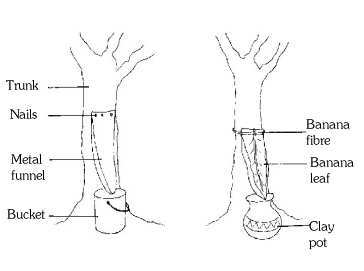 This technology is useful for people cannot afford a metal roof and are not near other sources of free water like springs, wells or boreholes, but who have trees in their compounds. Rain falling on the foliage runs down the tree trunk, and is funnelled by a banana leaf or metal sheet attached to the trunk into a bucket, pot or storage tank. Rainwater can be harvested from trees anywhere: it is a question of finding out which trees are appropriate. The best ones have short, smooth trunks, thick crowns and heavy foliage. Jackfruit (Artocarpus heterophyllus) and wild fig (Ficus natalensis) are very suitable. This method is cheap and easy to set up. While the water collected is not as clean as that from a metal roof, it is cleaner than that collected from thatched roofs. It should be filtered and boiled or SODIS should be applied if it is used for drinking.