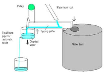 The tipping gutter first flush system is very simple to build, operate, and maintain. Water from the roof lands on a piece of guttering which is tipped down away from the water tank. Therefore the first rains and their debris pour away from the tank and into a storage vessel. The end of the guttering is attached via a pulley to the diverted water tank, and so as the diverted water tank gets fuller (and therefore heavier) it lifts up the end of the tipping gutter. Now the (hopefully) clean water from the roof is directed into the water tank.