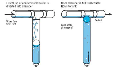 Every roof and every location is different. Basically, the larger the roof and the longer the periods between rain fall, the larger the quantity of water which must be disposed of in the first flush. In the case of the tipping gutter system this is achieved by using a suitably large diverted water tank and weighting the gutter to ensure that it tips when the required amount of water has been diverted. Again with the floating ball system, the bottom chamber of the first flush tank must be sized appropriately so that rainwater is only allowed into the storage tank after the first flush has been collected.