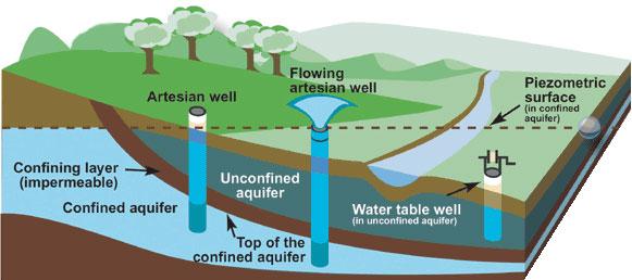 | Illustrations of ground water aquifers with artesian and water table wells (Environment Canada 2004) |