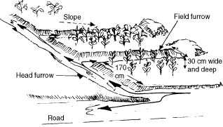 | With the broadbed-and-furrow system, runoff water is diverted into field furrows, allowing to sink into the soil in order to raise the water-table and increase the soil-moisture leve. (IIRR) |