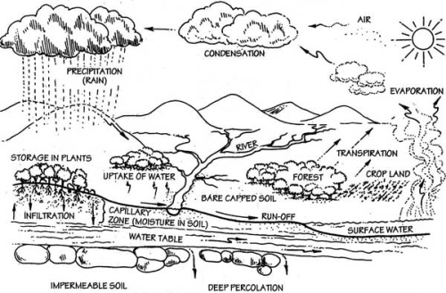 | This illustration of the water cycle shows the way of the water from the ocean, through the atmosphere, brought back to the earth by rain, evaporating again or flowing back to the see, either as surface water or in groundwater flows (Vukasin et al. 1995). |
