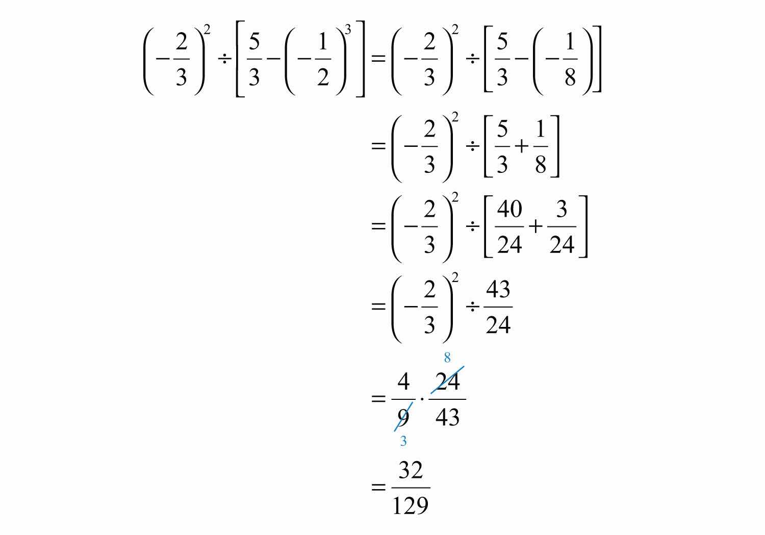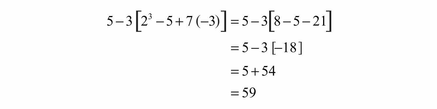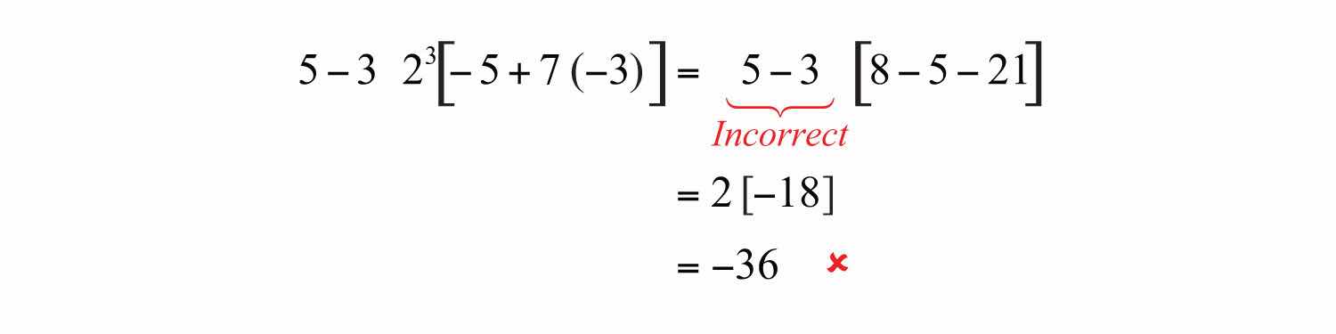 Solution: It is tempting to first subtract 5 − 3, but this will lead to an incorrect result. The order of operations requires us to simplify within the brackets first.