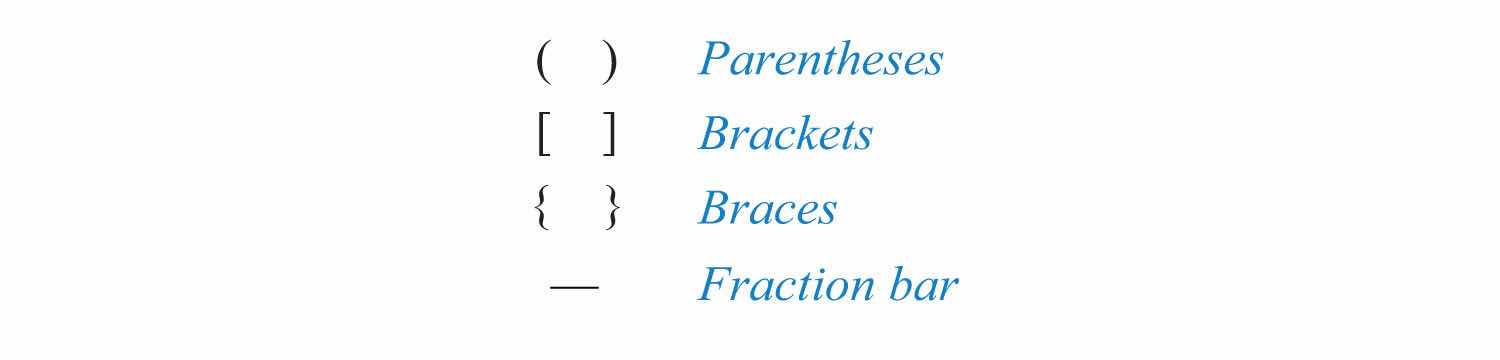 In a computation where more than one operation is involved, grouping symbols help tell us which operations to perform first. The grouping symbolsParentheses, brackets, braces, and the fraction bar are the common symbols used to group expressions and mathematical operations within a computation. commonly used in algebra are