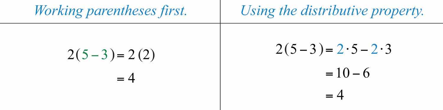 Certainly, if the contents of the parentheses can be simplified, do that first. On the other hand, when the contents of parentheses cannot be simplified, multiply every term within the parentheses by the factor outside of the parentheses using the distributive property. Applying the distributive property allows you to multiply and remove the parentheses.