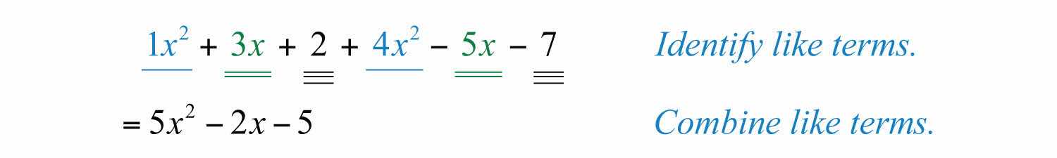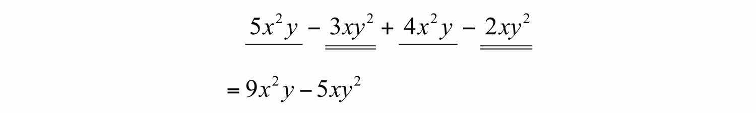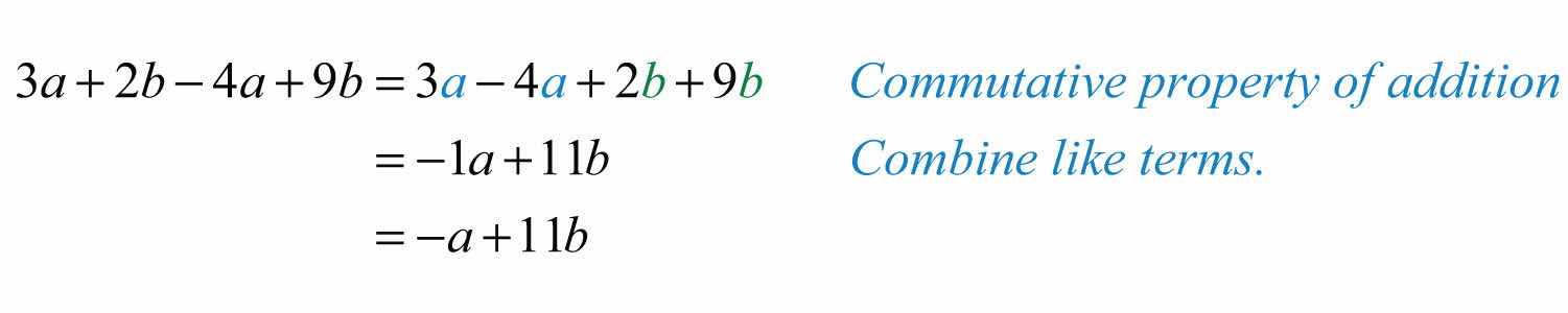 In other words, if the variable parts of terms are exactly the same, then we may add or subtract the coefficients to obtain the coefficient of a single term with the same variable part. This process is called combining like termsAdding or subtracting like terms within an algebraic expression to obtain a single term with the same variable part.. For example,