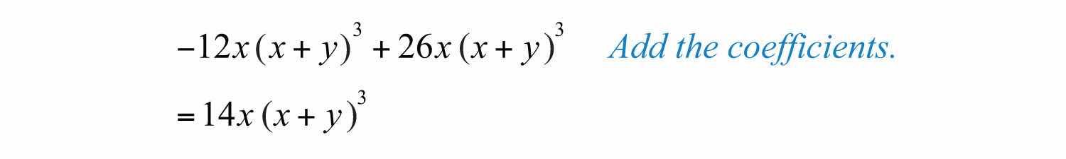Solution: Consider the variable part to be . Then this expression has two like terms with coefficients −12 and 26.