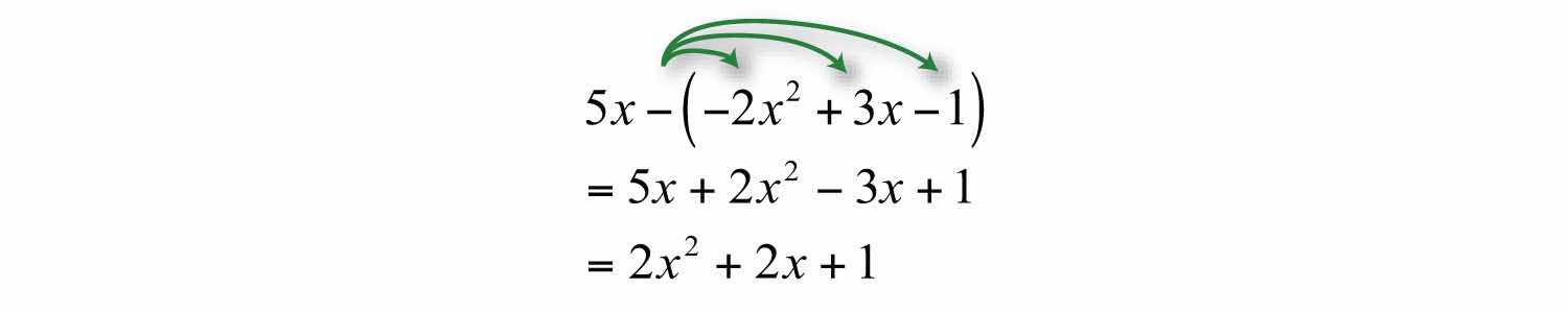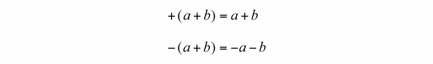 Often we will encounter algebraic expressions like or . As we have seen, the coefficients are actually implied to be +1 and −1, respectively, and therefore, the distributive property applies using +1 or –1 as the factor. Multiply each term within the parentheses by these factors: