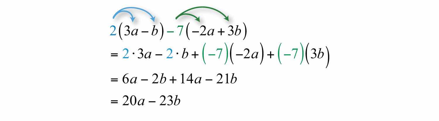 In the example above, it is important to point out that you can remove the parentheses and collect like terms because you multiply the second quantity by −7, not just by 7. To correctly apply the distributive property, think of this as adding −7 times the given quantity, .