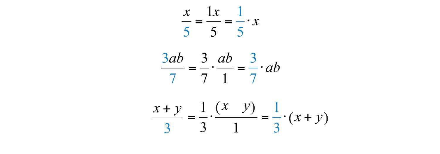 Division in algebra is often indicated using the fraction bar rather than with the symbol (÷). And sometimes it is useful to rewrite expressions involving division as products: