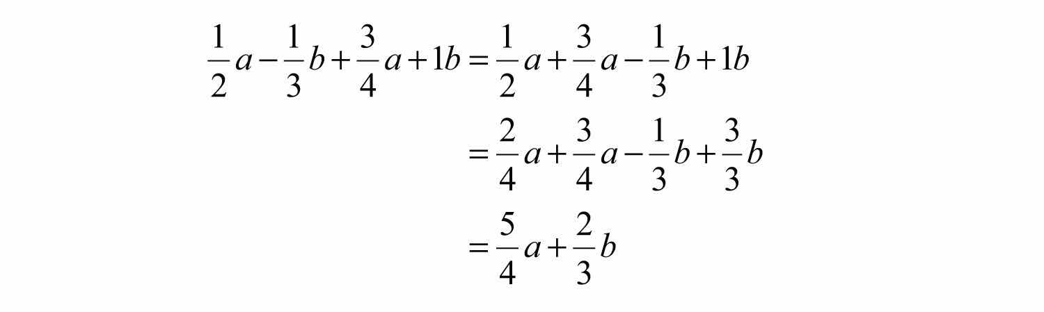 Solution: To add the fractional coefficients, use equivalent coefficients with common denominators for each like term.