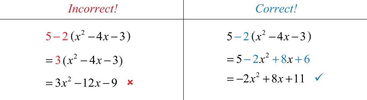 Solution: The order of operations requires that we multiply before subtracting. Therefore, distribute −2 and then combine the constant terms. Subtracting 5 − 2 first leads to an incorrect result, as illustrated below: