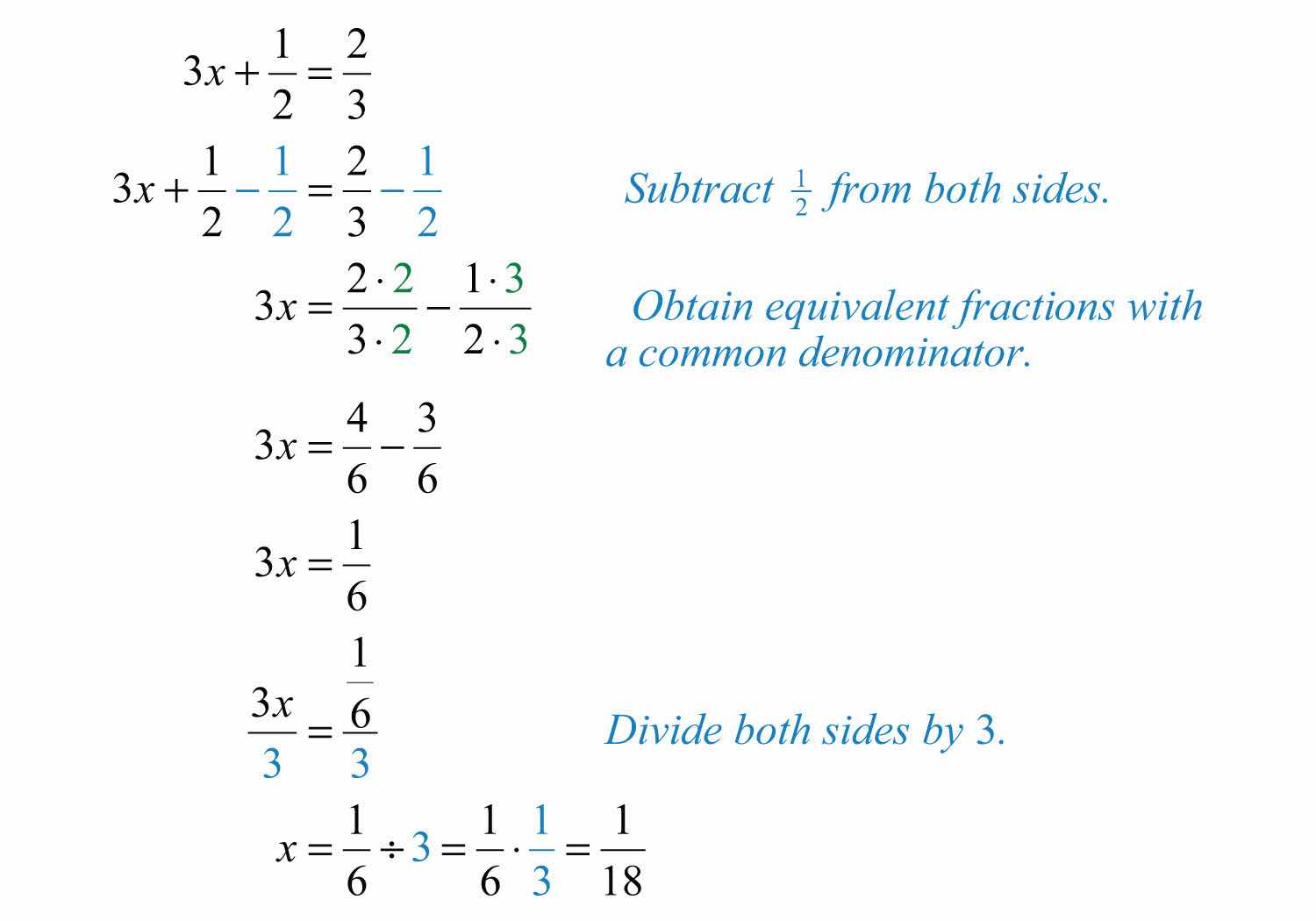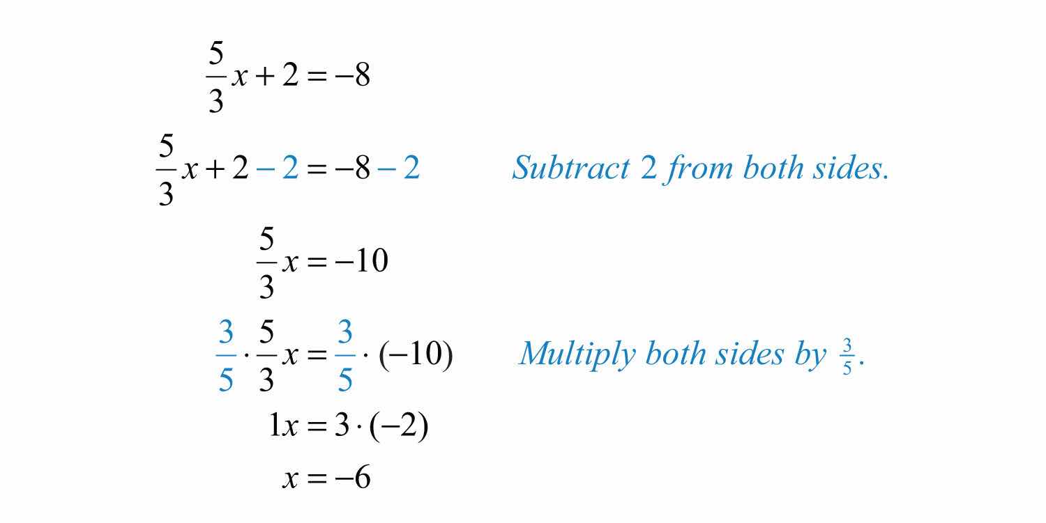 Solution: Isolate the variable term using the addition property of equality and then multiply both sides of the equation by the reciprocal of the coefficient .